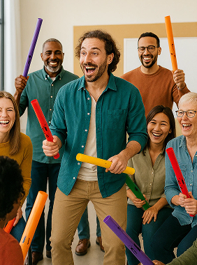 Con boomwhackers (tubos musicales de colores), los equipos se convierten en verdaderos xilófonos humanos para construir piezas rítmicas colectivas que fortalecen la sincronía, la energía y la conexión emocional. Un juego colectivo, divertido e inspirador que sirve incluso como rompe hielo o cierre memorable.